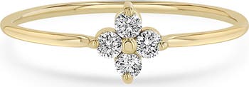 Pretty pavé diamonds cluster in floral formation at the center of this slender ring rendered in 14-karat gold.