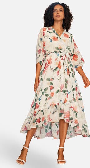 With wedding season fast approaching, this is house designed midi dress from Yumi fits the RSVP for any occasion. With a wrap over neckline, tie belt at the waist and flowy midi dip hem length. The style sleeves add a flattering element to this dress. With all over floral print that is feminine and unique.