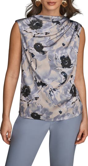 Strategic gathers drape the folded cowl neckline of a lightweight sleeveless top printed with watercolor poppies.