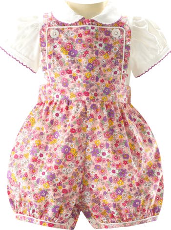 Frill trimmed dungarees patterned with a vintage floral design in shades of purple and pink, finished with an ivory piping trim. With adjustable crossover straps and button opening at the inner leg for easy changing. Includes a soft jersey blouse to complete Rachel Riley look.