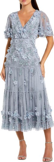 Romantic and refined, this embellished mesh dress features flutter sleeves, 3D floral detailing, and shimmering beadwork with soft ruffle accents.
