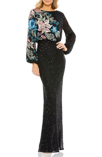 This gown stuns with intricate embellishments and a vibrant floral design. A high neckline adds sophistication, while the multi-color pattern enhances its charm.