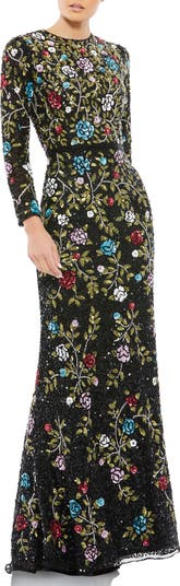 Long sleeve black gown with vibrant floral embroidery and sequin detailing—ideal for galas, weddings, or elevated evening events.