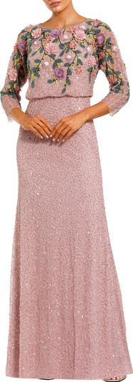 Elegant beaded mesh gown with a bateau neckline, sheer three-quarter sleeves, and dimensional floral appliqués over a fitted silhouette.