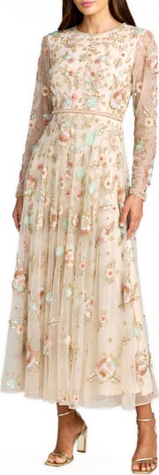 Floral embellished midi dress with long sleeves and sheer mesh overlay, featuring delicate beading and a flowing silhouette, perfect for weddings, parties, and elegant occasions.