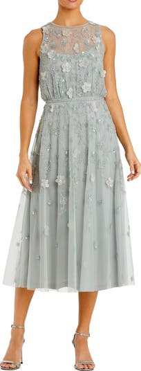 Elegant and feminine, this embellished midi dress features floral appliqué embroidery, an illusion high neckline, and a softly flowing A-line skirt.