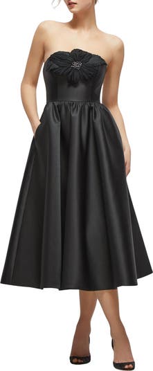 Floral Embellished Strapless Fit & Flare Midi Cocktail Dress