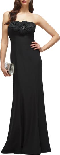 A jewel-centered floral appliqué makes an enchanting statement at the neckline of a strapless gown featuring a curve-skimming silhouette and balanced by a floor-pooling hem.