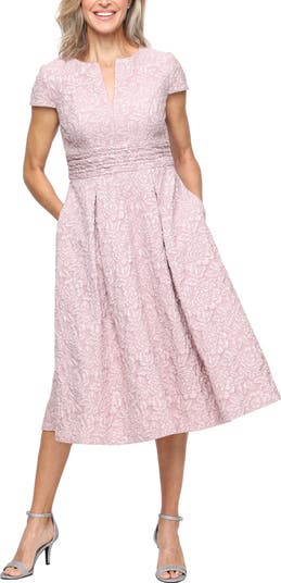 Floral-embossed crepe lends rich texture to this midi cocktail dress tailored with short sleeves and a sculpted bodice shaped by princess seams. A pleated waistband defines the fit before releasing into a softly pleated skirt for an elegant, refined finish.