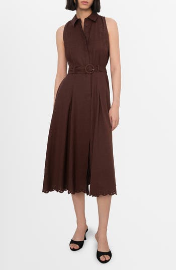 A scalloped belt cinches the waist of this fabulous cotton-and-linen midi dress cut in a sunny sleeveless silhouette and detailed with tonal floral embroidery.