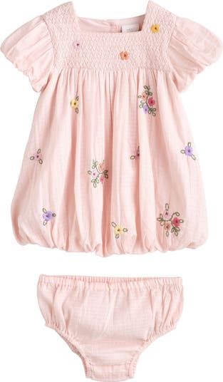 Baby is ready to take on warm-weather parties in this faintly checkered cotton set featuring a floral-embroidered bubble dress and a pair of matching bloomers.