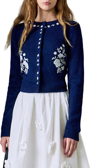 Dainty floral designs bring vintage-chic style to this crewneck cardigan knit with covered buttons to let the embroidery take the spotlight.