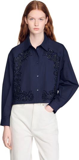 Oversized embroidered shirt with a floral print, featuring a shirt collar, long sleeves and an asymmetric hem.