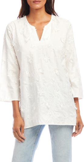 Intricate floral embroidery details this flowy, tunic-length top that's slit at the sides and made of lightweight cotton.