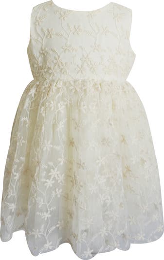 Baby will look precious in this little cap-sleeve dress with a lacy overlay and soft cotton lining.