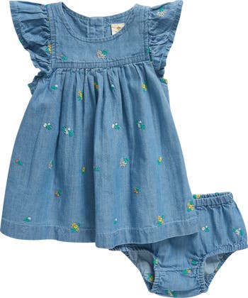 This cotton-rich embroidered dress is the picture of sweetness with flouncy flutter sleeves and matching bloomers to complete the look.