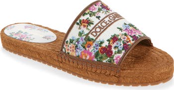 Step into a sun‑drenched Sicilian villa in this summery shoe from the Re‑Edition 2000 collection. Rooted in the bold floral tradition of southern Italy, pretty rose bouquets vine the lustrous silk-satin upper of this sandal set on a low pedestal heel.