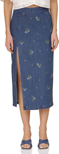Sweet and sultry, this high-waisted denim midi skirt is abloom with embroidered flowers and showcases a thigh-high slit for sunny-day appeal.