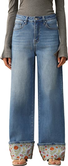 Intricate floral embroidery enhances the boho vibes of cuffed, high-waist jeans cut from low-stretch denim in a wide-leg silhouette.