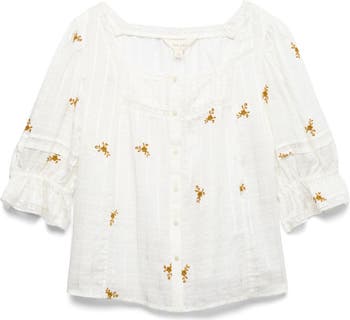 Lace trim and floral embroidery lend a romantic touch to this square-neck top where tonal checks add quiet texture to the button-up design.