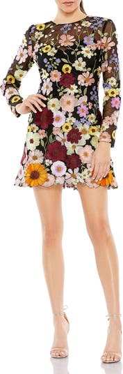 Elegant sheer floral-embroidered dress with an illusion high neckline, long sleeves, and hand-stitched appliqué. Partially lined bodice, fully lined skirt