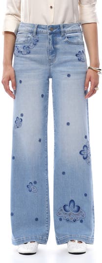 Floral Embroidered Mid Rise Wide Leg Jeans