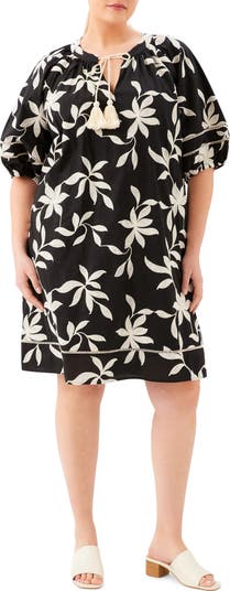 Embroidered blooms provide beautiful texture on a puff-sleeve shift dress made from pure cotton and finished with swingy tassel ties and handy side pockets.