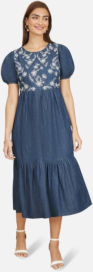We can't get enough of pretty adornments this season, and this chambray denim dress lets you wear them everyday. The lightweight fabric, combined with the puff sleeve design and gorgeously embroidered bodice make this dress a stand out. The tiered midi length hemline is flowy and comfortable in a soft chambray denim made from cotton.