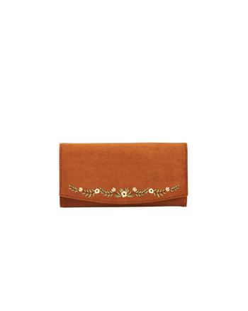 Let your imagination wander on countryside strolls with our Tan Floral Embroidered Purse. Crafted in soft faux suede, it is adorned with delicately embroidered blooms and subtle gold-toned hardware, bringing a touch of charm to everyday life. Inside, a slip pocket, five card slots, and a zipped compartment keep your treasures safe.