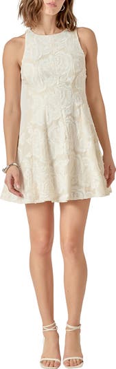 Big embroidered blooms charm a sleeveless fit-and-flare minidress perfect for parties and events.