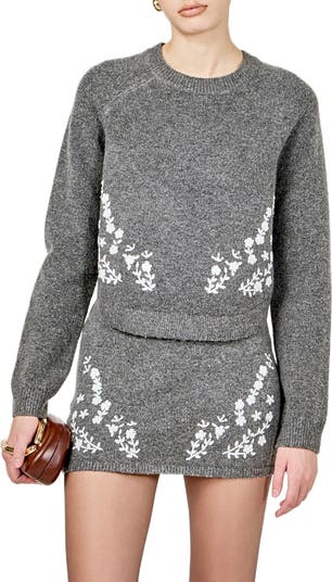 Flowery stitching sweetens this crewneck sweater framed by structured raglan sleeves.