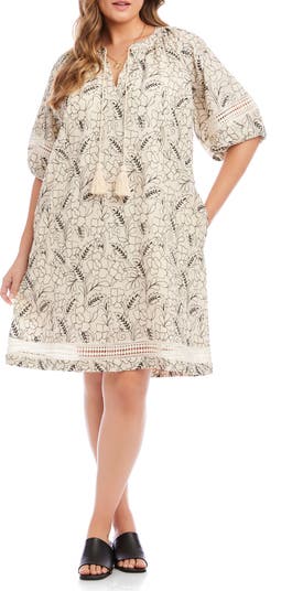 Tassel-adorned ties fall from the neck of this playful cotton dress covered in floral embroidery and framed by voluminous puff sleeves.