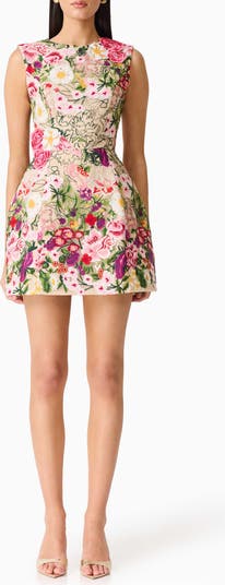 Three-dimensional floral appliqués and intricate embroidery bring whimsical romance to this fit-and-flare minidress finished with a tulip hem.