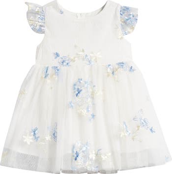 Dainty floral embroidery adds a delightful touch to the gauzy tulle overlay of this picture-perfect dress.