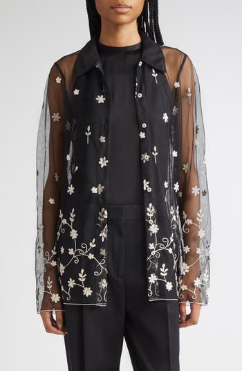 Dainty embroidered flowers twine across the diaphanous tulle of this top that offers a romantic take on the classic button-up shirt.