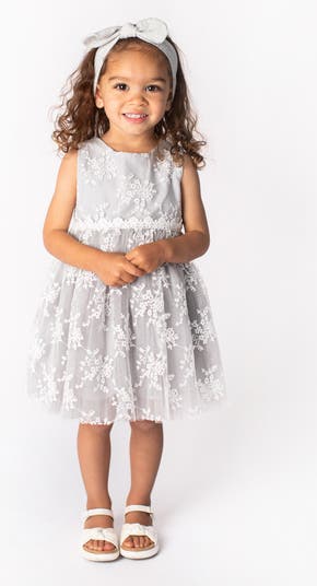 Floral-embroidered tulle makes this flouncy sleeveless dress an enchanting option for your little one.