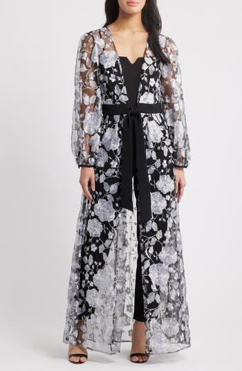 Bring boho chic elegantly to the party circuit in a set that features a sleek, ankle-grazing jumpsuit paired with a flower-powered long jacket.
