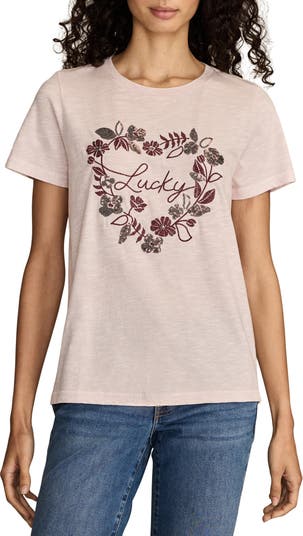 Floral Embroidery Lucky Heart Classic Crewneck Cotton Graphi T-Shirt