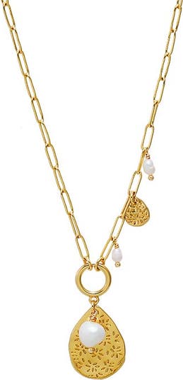 The Floral Etched Pearl Charm Necklace by Adina Eden adds refined flair to any outfit with its elegant Necklace shape. This refined charm necklace for women pairs delicate structure with vibrant tones, now in Gold. Your everyday style deserves more—this effortless layer adapts to your mood, your outfit, and your pace—no questions asked. Stack this gold plated charm necklace with styles from our Charms & Pendants collection to keep things polished, modern, and fun. It completes your outfit without competing with it.