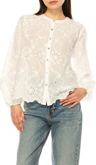 A romantic button-up top blooms with vintage charm, cut from cotton eyelet lace and dotted with three-dimensional floral appliqués. Balloon sleeves and a scalloped hem enhance the heirloom feel, giving the whole piece the look of a delicate treasure rediscovered.