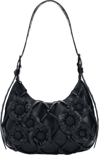 Tonal floral appliqués and a woven design highlight the sleek faux-leather exterior of a '90s-inspired bag featuring an adjustable shoulder strap for a variety of ways to wear.