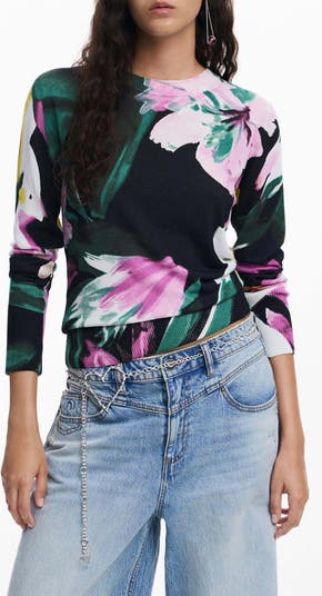 Bold blooms branch across a trim crewneck sweater fashioned from a fine-gauge knit.