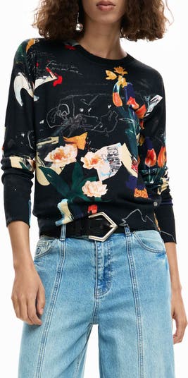 Garden blooms are artfully illustrated on this season-brightening crewneck sweater made from a fine gauge knit kissed with linen.