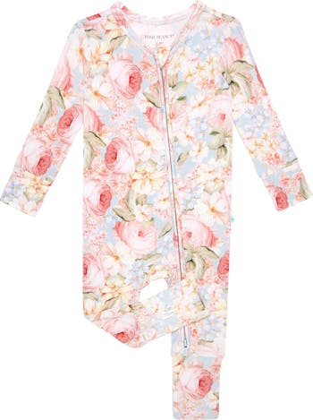 A whimsical floral pattern brings abundant charm to this zip footie made from buttery-soft fabric and finished with grips on the feet for steady standing and stepping.