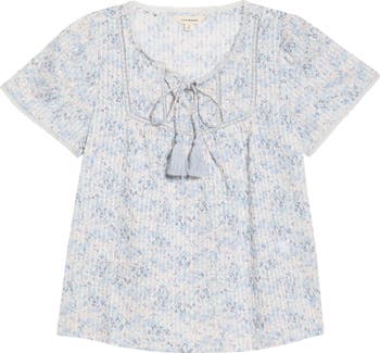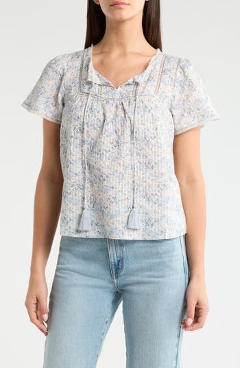 A tassel tie adds a bit of boho style to a cotton-forward top scattered in tiny blooms.