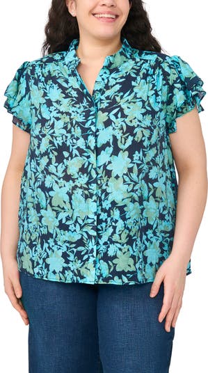 Washed florals and tiered flutter sleeves bring easy charm to this lightweight shirt finished with a polished hidden-button placket.
