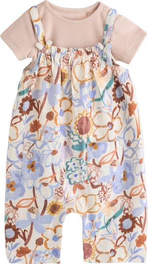 Watercolor blooms bring painterly flair to this tot-sized set featuring a ribbed cotton bodysuit and an all-cotton romper detailed with sweet bow straps.