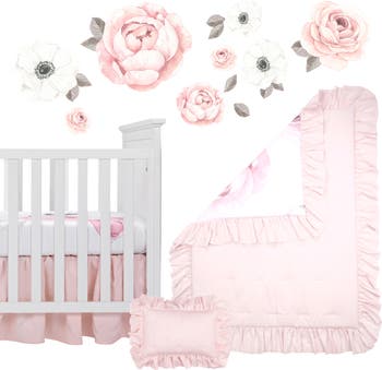 - 5-piece crib bedding set includes one quilt, one 100% cotton fitted crib sheet, one pink shirred crib skirt, one decorative pillow and a complete set of wall decals