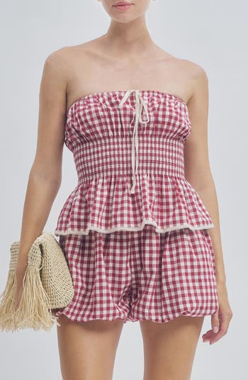 Floral gingham brings playful charm to this strapless lace-trim top fashioned with a smocked waist and flared peplum hem.