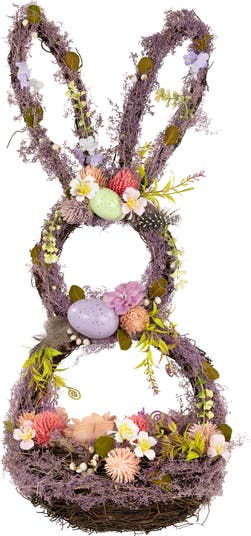 This adorable bunny-shaped basket is crafted from grapevine and is filled with vibrant Easter inspired greenery and pastel-colored eggs. The purple hue adds a pop of color to your home while the intricate design and details make it a truly eye-catching piece. Hang this basket on your front door or use it as a centerpiece on your Easter table to create a whimsical and festive atmosphere. Whether you're celebrating Easter or simply embracing the arrival of spring, this bunny-shaped basket is a delightful addition to your home decor. Product Features: Bunny-shaped grapevine Easter basket Crafted from grapevine and mixed greenery Embellished with pastel green, pink, purple and white speckled eggs Wooden flowers, preserved leaves and globe thistle accents Weighed bottom for stability For indoor use only Dimensions: 21"H x 9"W x 6.5"D Material(s): grapevine/plastic/fabric/foam/preserved greenery